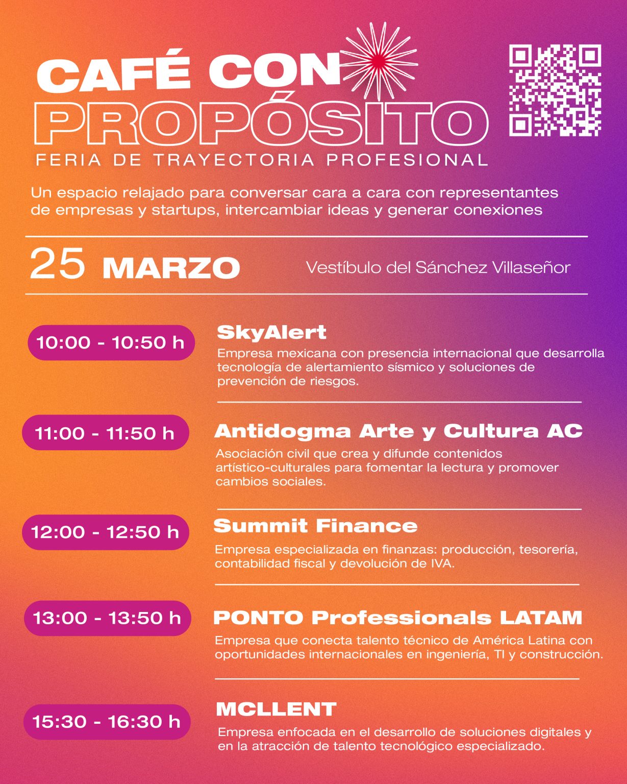 Durante este evento podrás conectar con más de 80 empresas de diversas industrias, descubrir rutas profesionales y explorar opciones reales para tu crecimiento.