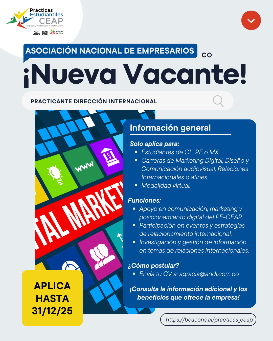 Descubre las vacantes para prácticas profesionales de Primavera 2026 y accede a experiencias que te permitirán desarrollar tus habilidades y dar un gran impulso a tu carrera, envía tu CV al correo que aparece en la vacante que llamó más tu atención.